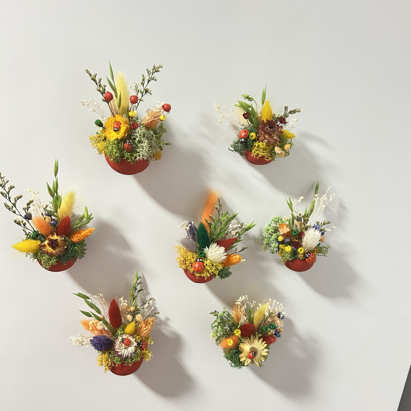 Realizat manual din flori de paie, plante uscate și licheni stabilizați, aranjamentul îmbină texturi naturale și culori armonioase, completate de detalii decorative atent alese. Vasul tip bell cup oferă stabilitate și un aspect compact, iar magnetul integrat permite fixarea ușoară pe suprafețe metalice precum frigiderul, tabla magnetică sau alte elemente decorative din metal.